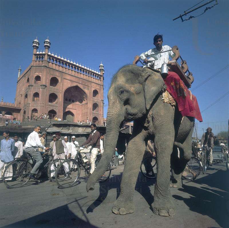 | Ritratto di uomo indiano con elefante, sullo sfondo il portale della Grande Moschea Jama Masjid, Delhi Fonte visiva 1965 | Fonte visiva | 1965 | |||||