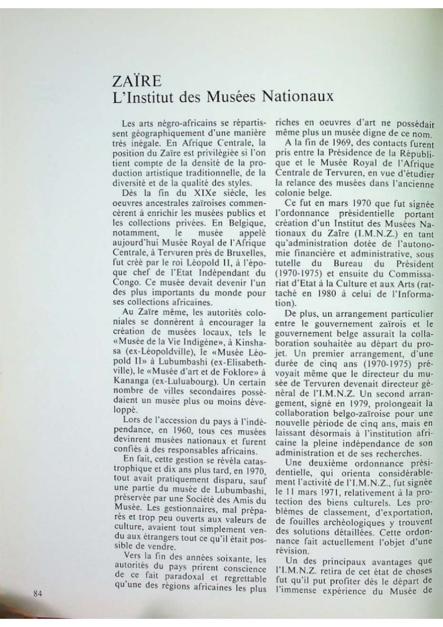 | Zaïre. L'Institut des Musées Nationaux Fonte testuale primavera 1984 | Fonte testuale | primavera 1984 | |||||