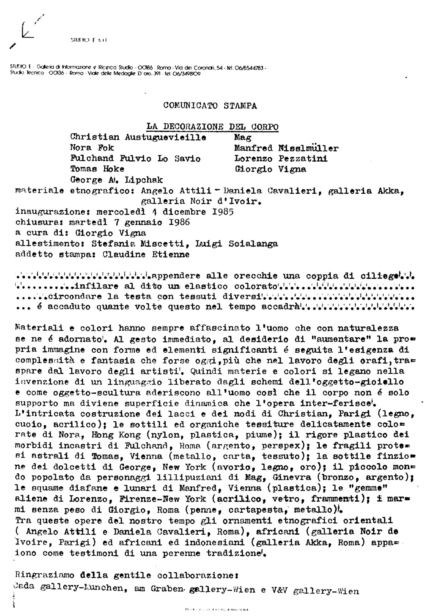 | Comunicato stampa mostra La decorazione del corpo Fonte testuale 04-12-1985 - 04-12-1985 | Fonte testuale | 04-12-1985 - 04-12-1985 | |||||