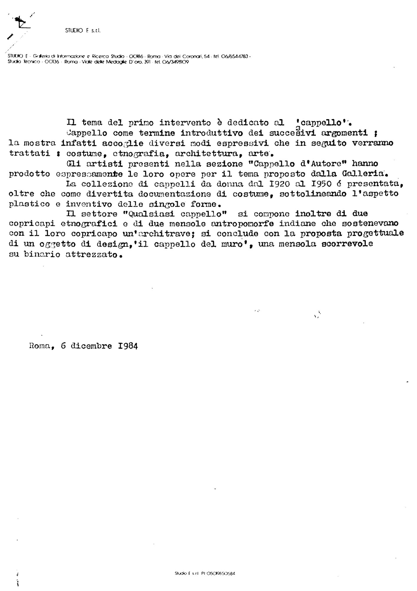 | Comunicato stampa mostra Il cappello Fonte testuale 06-12-1984 - 06-12-1984 | Fonte testuale | 06-12-1984 - 06-12-1984 | |||||