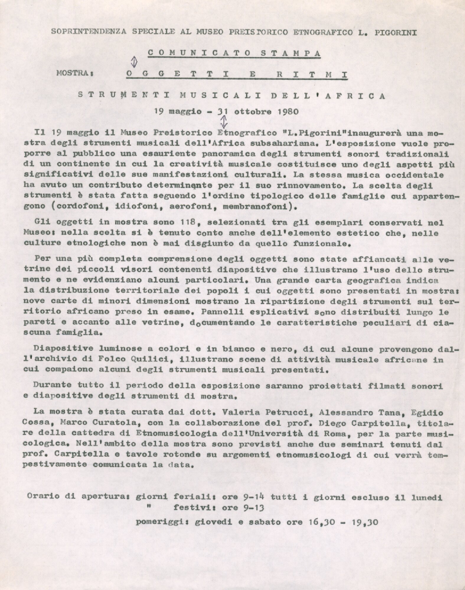 | Comunicato stampa "Oggetti e ritmi. Strumenti musicali dell'Africa" Fonte testuale 19 maggio - 31 ottobre 1980 | Fonte testuale | 19 maggio - 31 ottobre 1980 | |||||