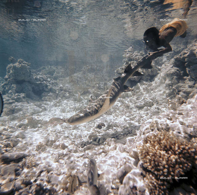 | Il ragazzo interprete del film "Ti-koyo e il suo pescecane" gioca con uno squalo nutrice (Nebrius ferrugineus) nelle acque basse dell'atollo di Manihi Fonte visiva 1961 | Fonte visiva | 1961 | |||||