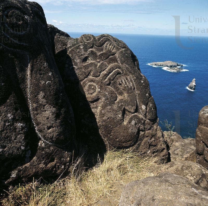 | Incisione rupestre (petroglifo) polinesiana rappresentante un uomo uccello; Orongo, promontorio dell'Isola di Pasqua Fonte visiva 1969 | Fonte visiva | 1969 | |||||