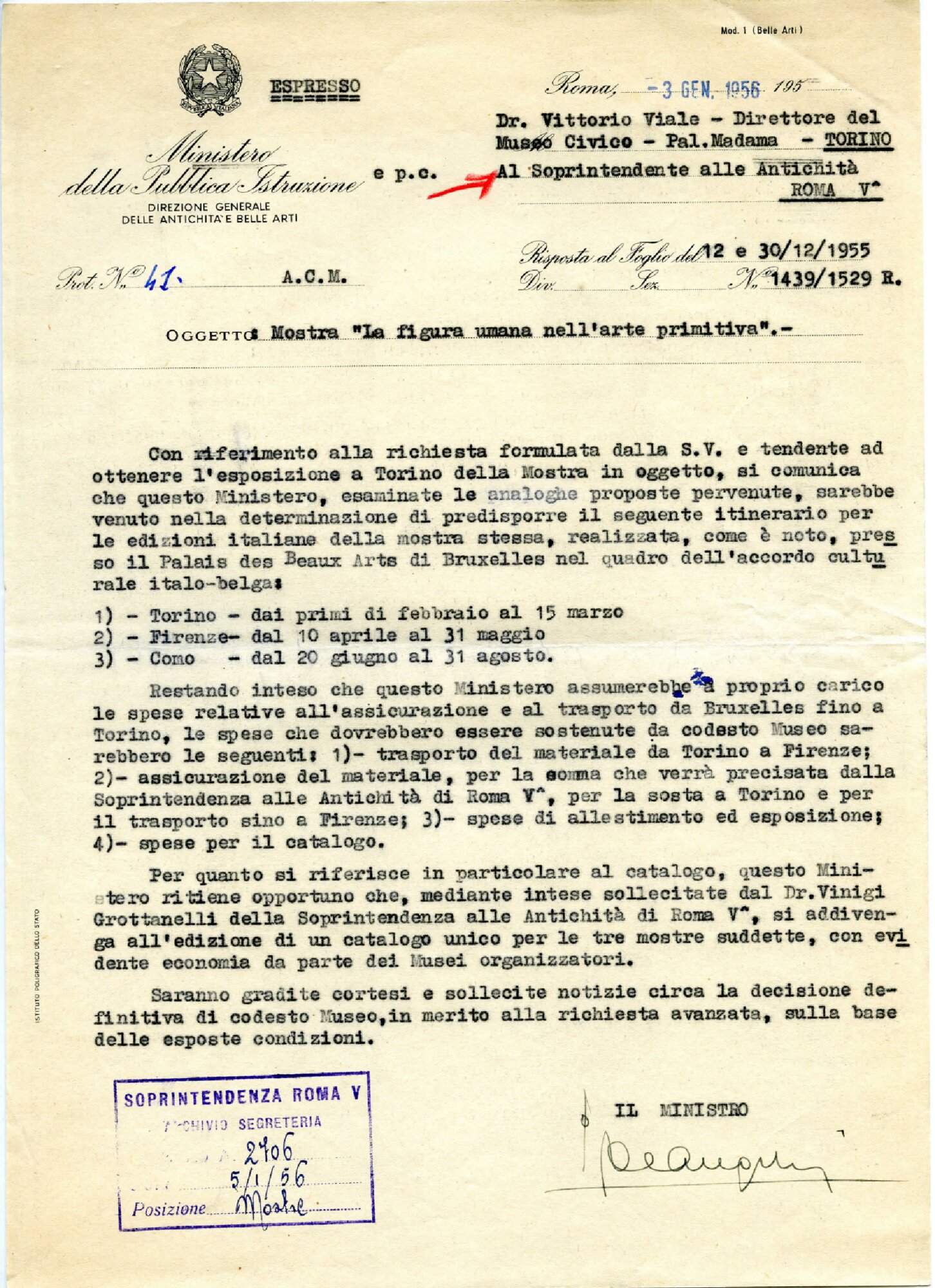 | Lettera dal Ministero della Pubblica Istruzione a Vittorio Viale Fonte testuale 03-01-1956 | Fonte testuale | 03-01-1956 | |||||