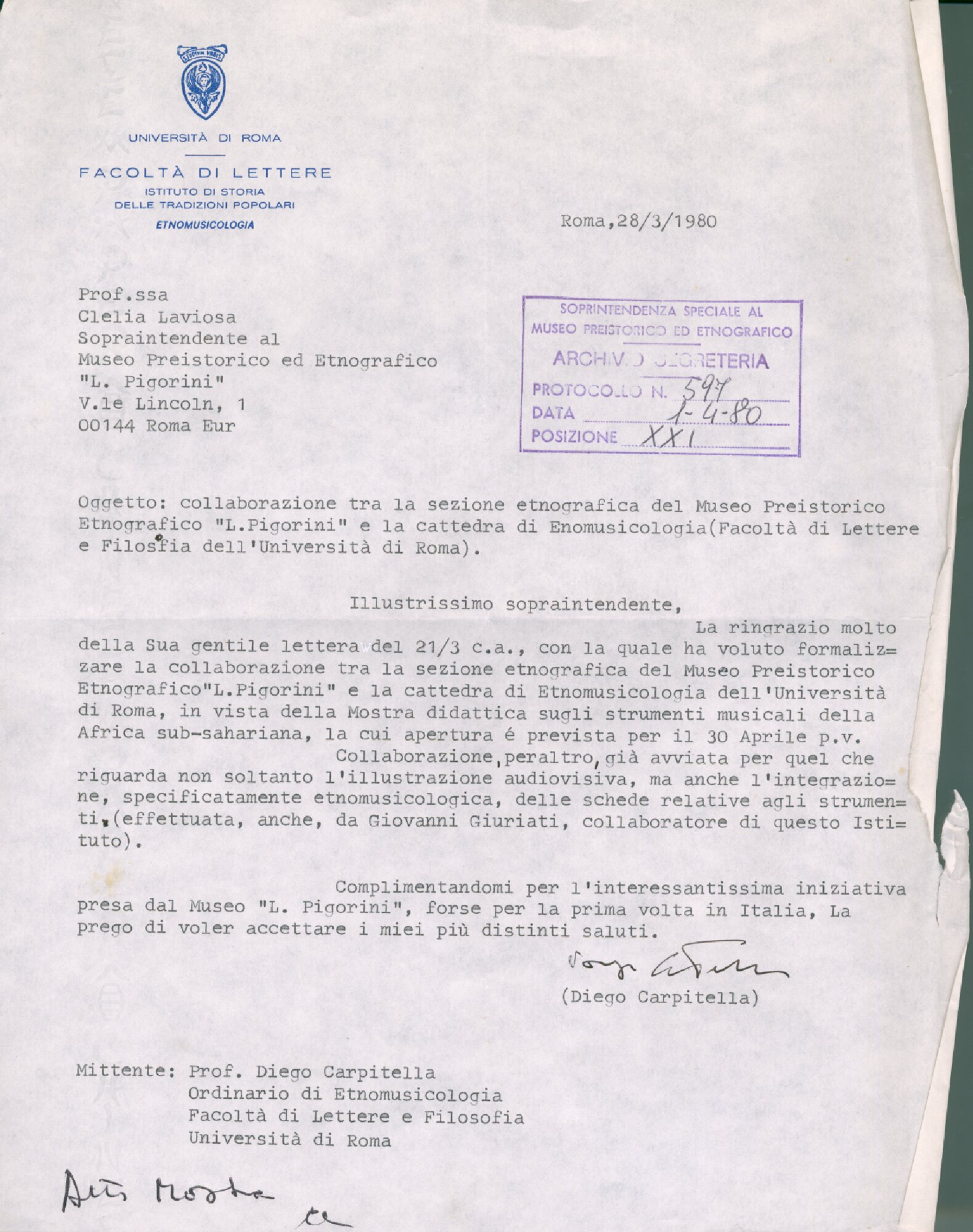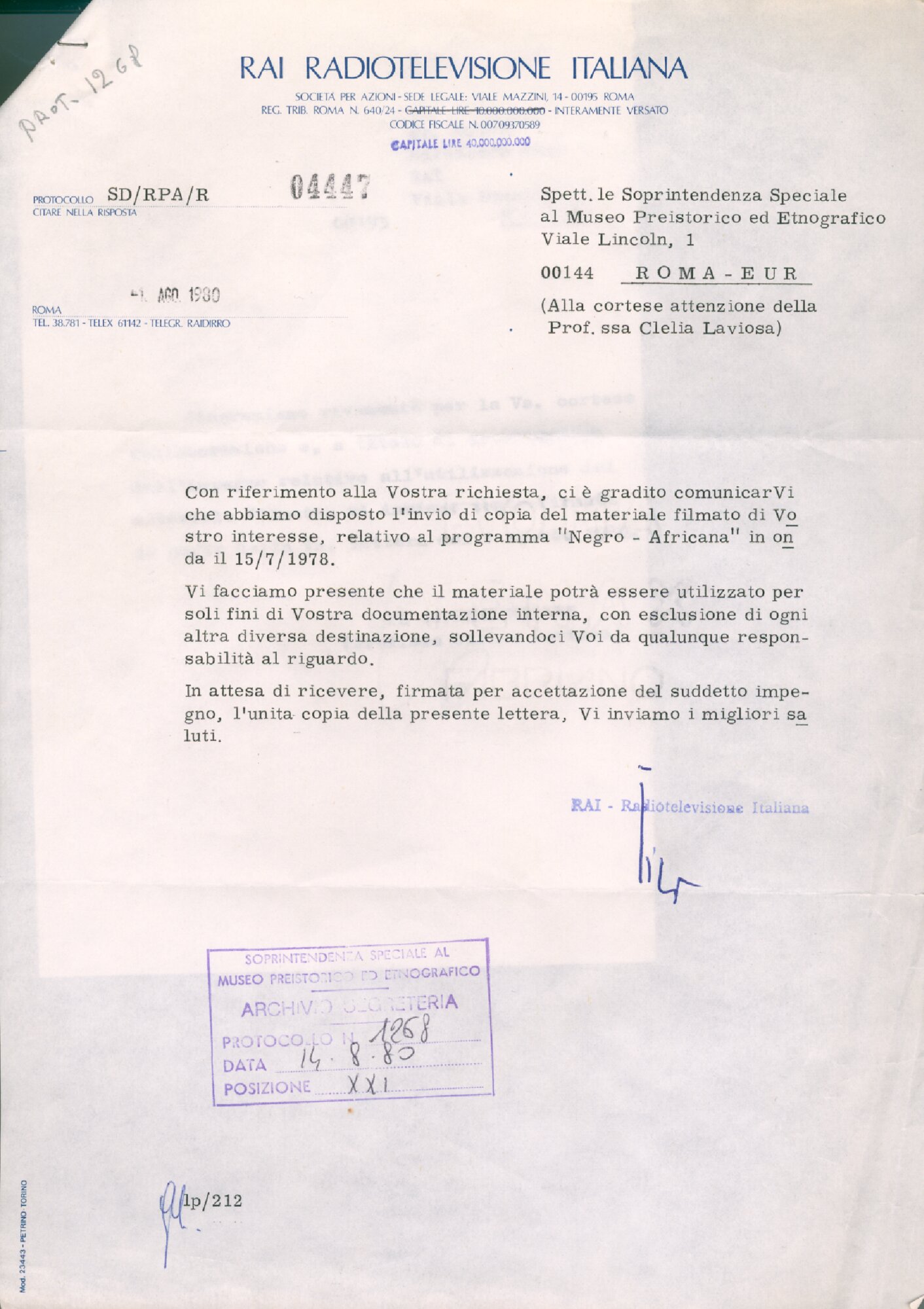 | Lettera della RAI alla Soprintendenza Speciale al Museo Preistorico ed Etnografico Fonte testuale 14 agosto 1980 | Fonte testuale | 14 agosto 1980 | |||||