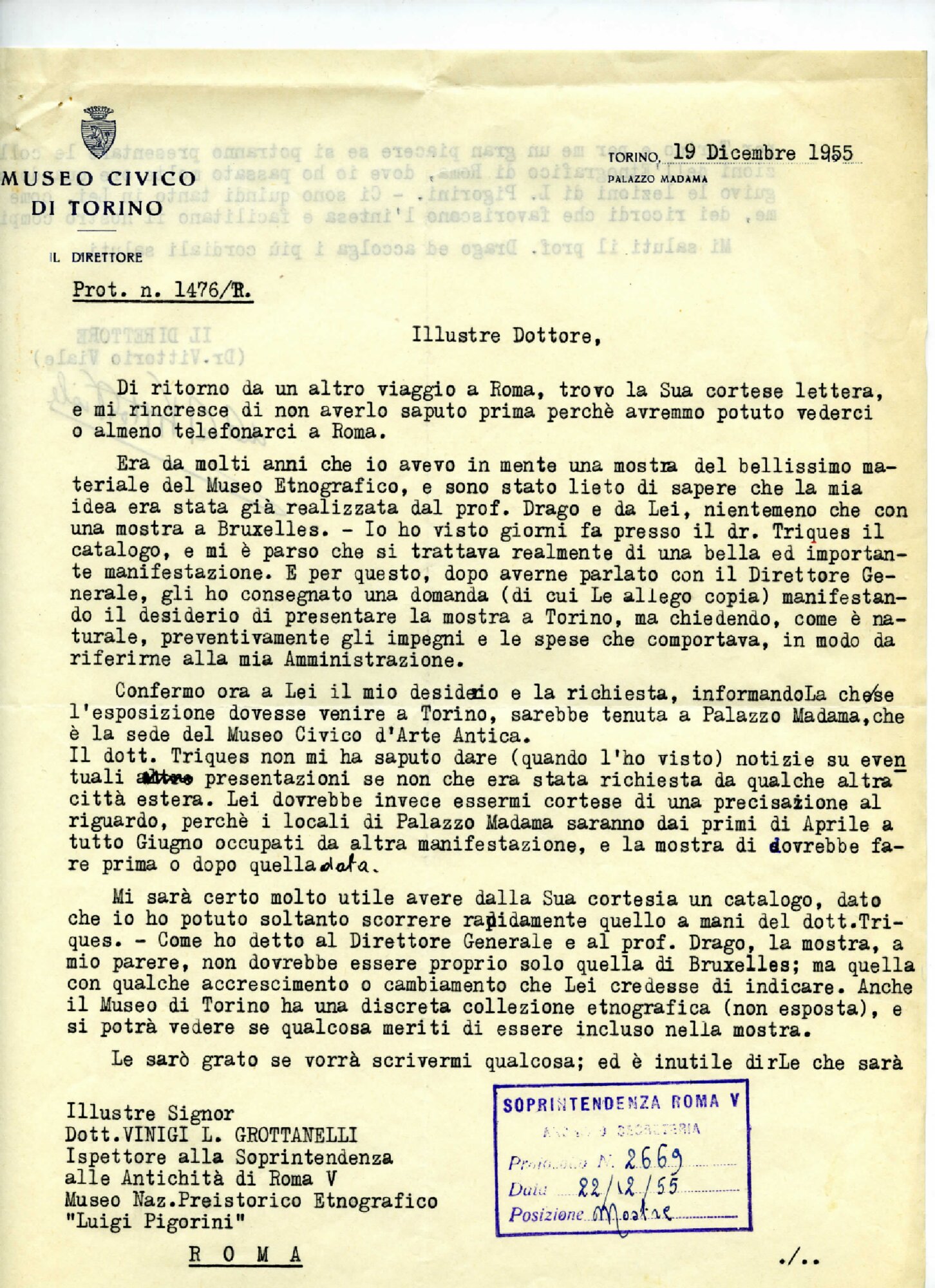 | Lettera di Vittorio Viale a Vinigi Grottanelli Fonte testuale 19-12-1955 | Fonte testuale | 19-12-1955 | |||||