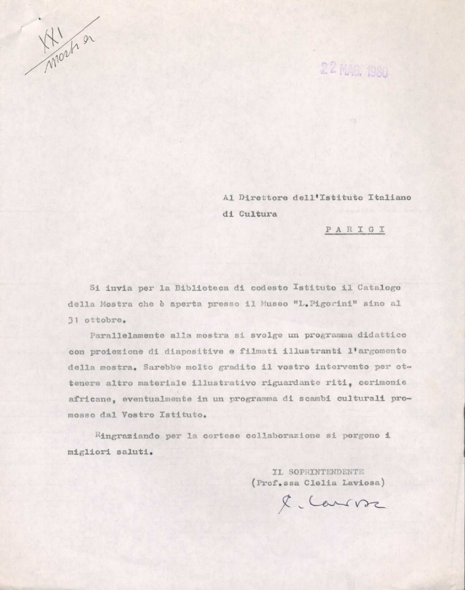 | Lettera di Laviosa al Direttore dell'Istituto Italiano di Cultura di Parigi Fonte testuale 22 maggio 1980 | Fonte testuale | 22 maggio 1980 | |||||